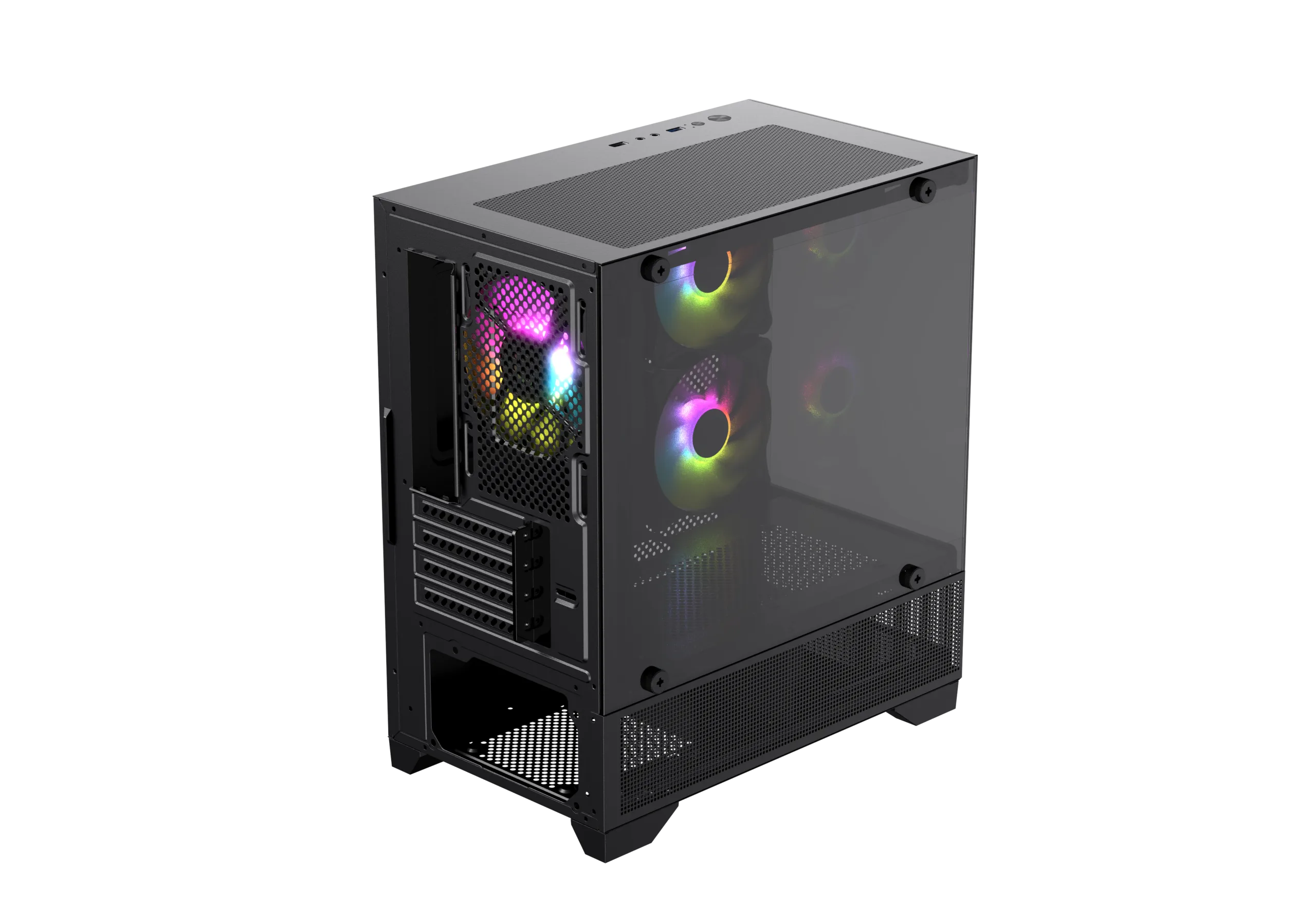 Compact gaming casing with tempered glass panel, efficient airflow support, and essential features for entry-level builds.